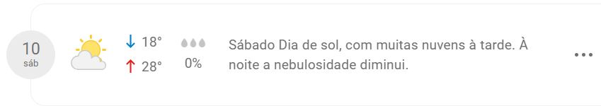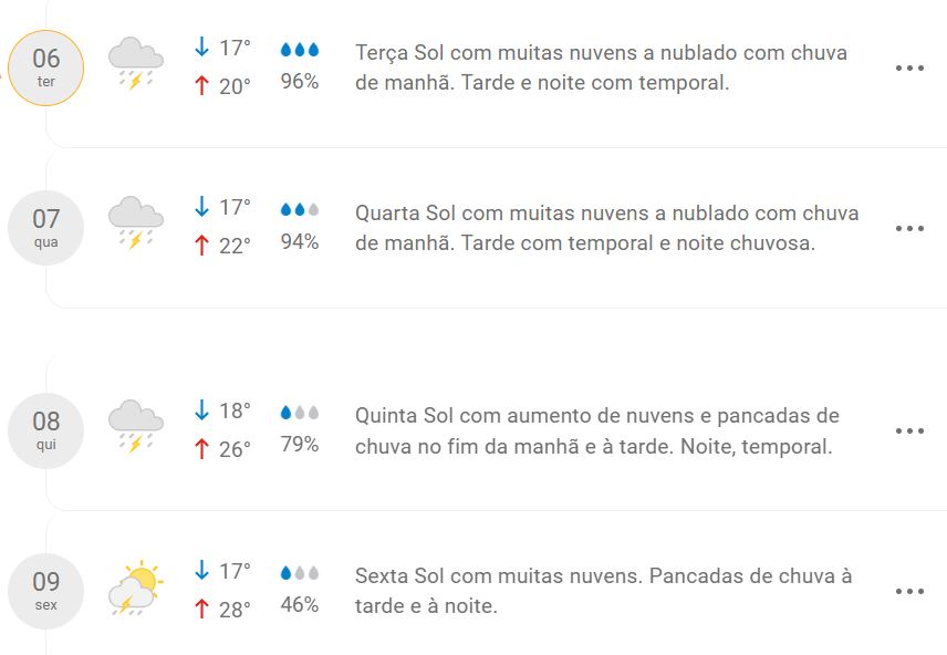 As temperaturas ao longo da semana devem variar entre mínima de 17 °C e máxima de 28 °C. O maior índice de probabilidade de chuva está previsto para a terça-feira (6), com 96%.