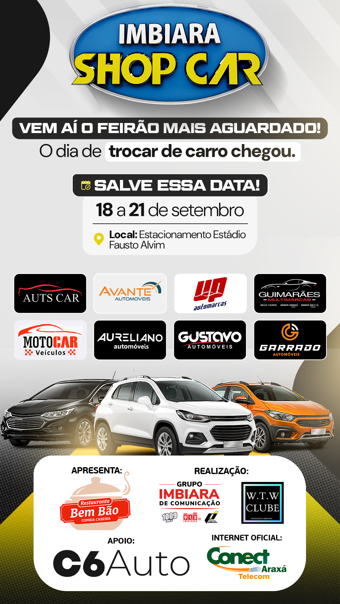 De 18 a 21 de setembro, Araxá recebe mais uma edição do Feirão Imbiara Shop Car, no estacionamento do Estádio Fausto Alvim. O evento é uma oportunidade para quem deseja comprar, vender ou trocar veículos em condições especiais.