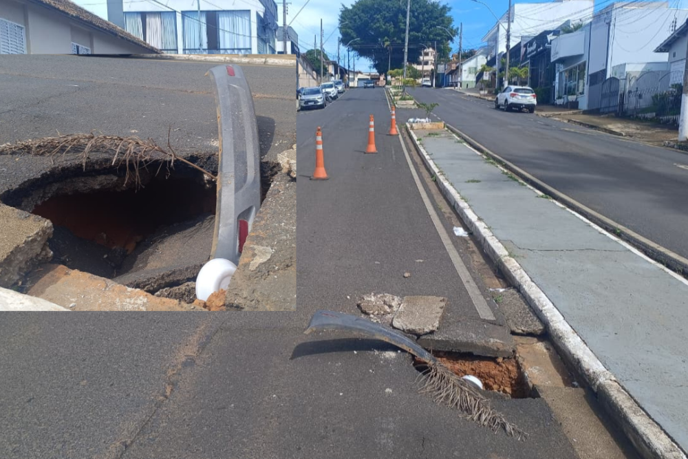 Ao verificar a ocorrência, a equipe constatou que, além da abertura na pista, havia um galho posicionado rente ao buraco e também vestígios de material que podem estar relacionados a um veículo. A suspeita é de que algum carro tenha passado pelo trecho e sofrido impacto ao cair na irregularidade formada no asfalto.
