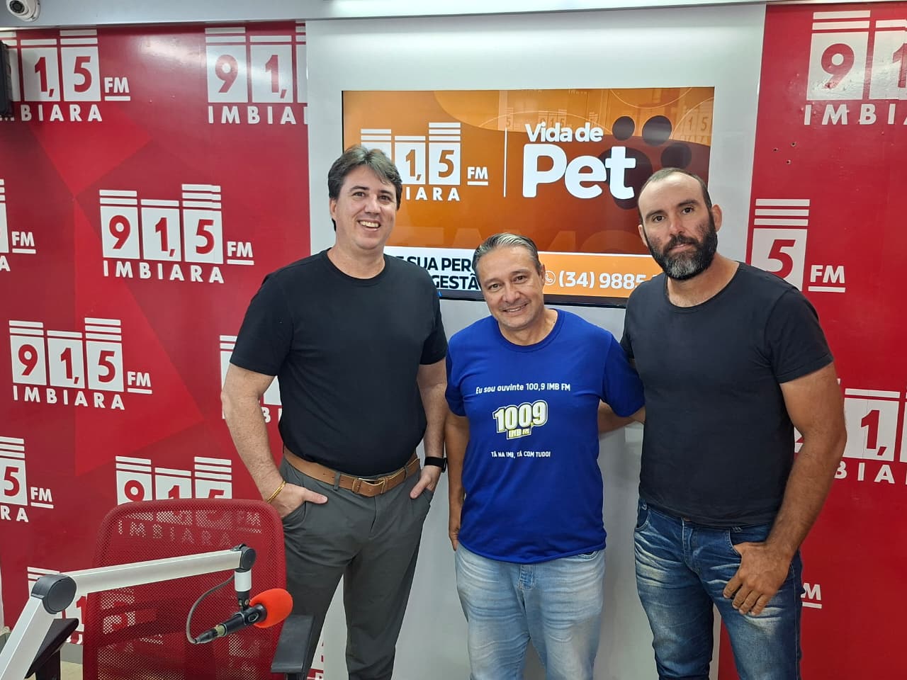 Emílio Borges e Edvaldo Gomes, apresentadores do Vida de PET, com o médico veterinário Wilker Paiva. Foto: Caio César/Portal Imbiara