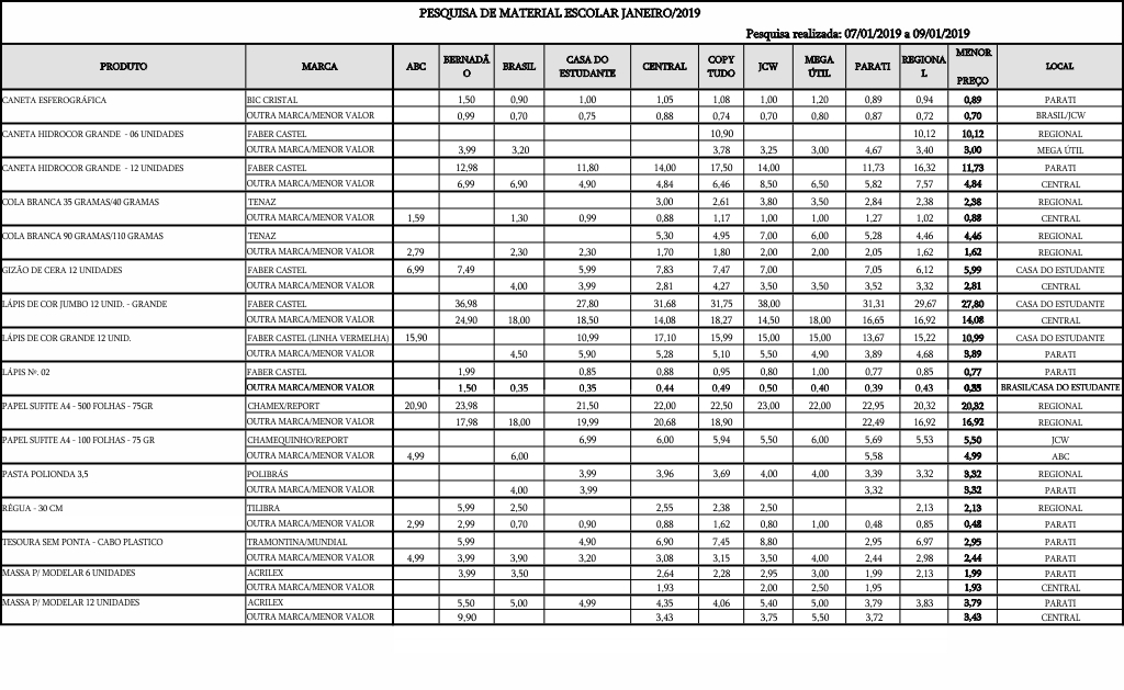 A pesquisa divulgada nesta sexta-feira, 11, apresenta o valor mais caro (marcas líderes de mercado) e o mais barato de cada item. A maior variação de preços em produtos de marcas diferentes foi registrada no apontador com depósito, que em um estabelecimento custa R$ 1,00 e em outro R$ 7,99 (699%). Já em produtos da mesma marca, a maior variação foi da borracha branca, o preço vai de R$ 0,48 a R$ 2,99 (523%).