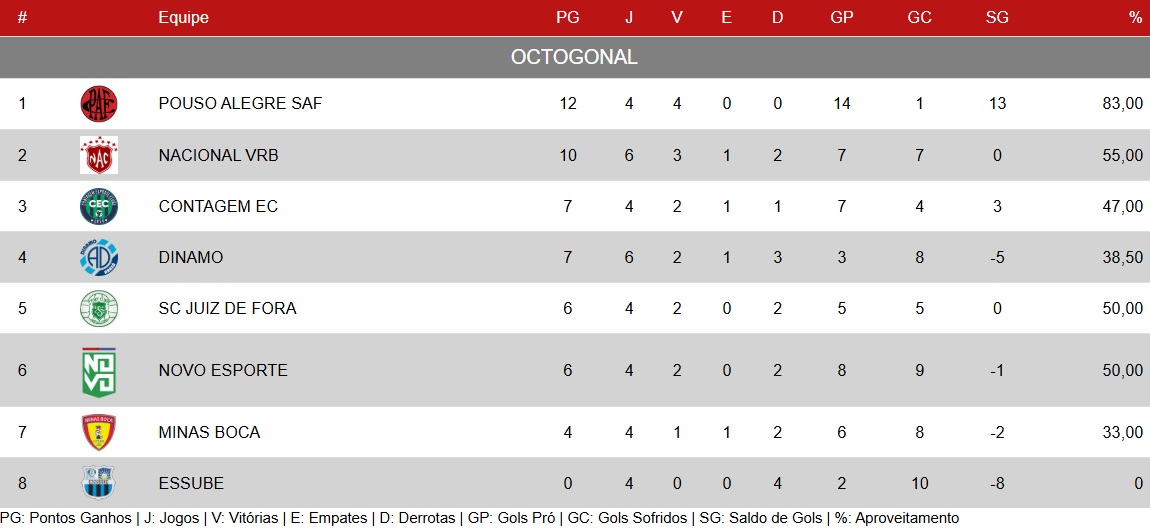 Com esses resultados, o Dínamo aparece fora do grupo dos três primeiros colocados que garantem o acesso à 1ª Divisão do Campeonato Mineiro de Base Sub-15 e Sub-17 de 2026. Já o Nacional subiu para a vice-liderança, com 10 pontos — três a mais que Contagem, terceiro colocado, e o próprio Dínamo.