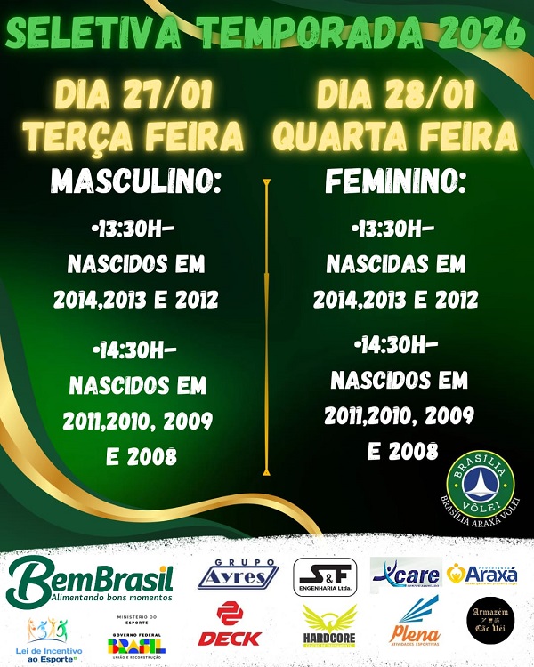 O Brasília Araxá Vôlei promove, nos dias 27 e 28 de janeiro, terça e quarta-feira, seletivas para a formação de novas equipes de base em Araxá. As avaliações vão disponibilizar 44 vagas para atletas das categorias sub-15, sub-17 e sub-19, nos naipes masculino e feminino, fortalecendo o trabalho de formação esportiva desenvolvido no município.