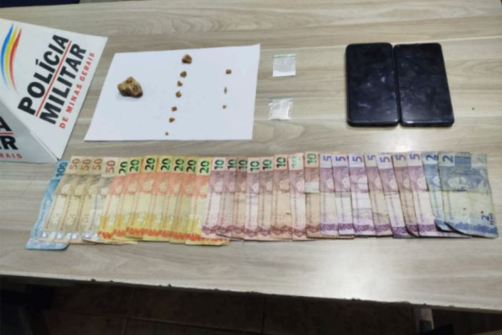 Durante as buscas, os militares encontraram dois papelotes grandes de cocaína, três buchas de maconha, uma pedra grande de crack, dois celulares e mais de R$ 500 em dinheiro.