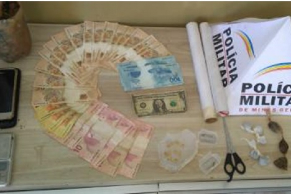 Dinheiro, drogras e materiais apreendidos. Foto: Polícia Militar / Divulgação