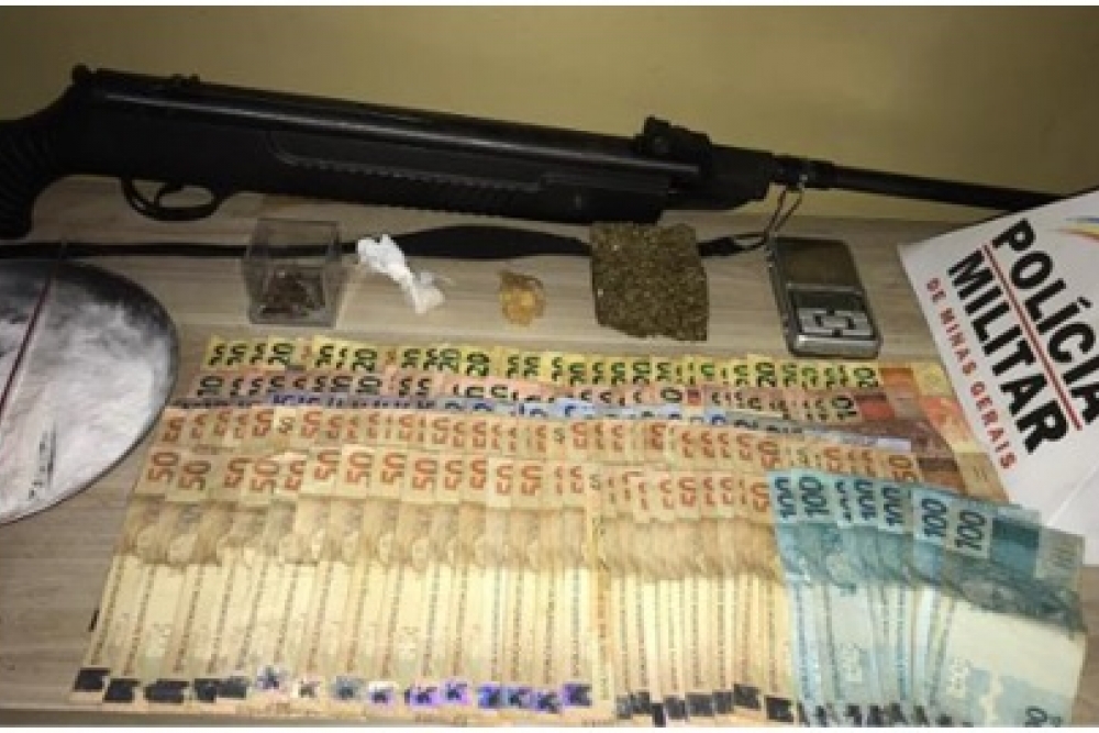 Na residência dele foi encontrada grande quantia em dinheiro espalhada em meio a pedras de crack, uma balança, uma faca suja de droga, uma frigideira com um pó branco e uma espingarda. Diante dos fatos, o traficante foi preso e todo material apreendido.