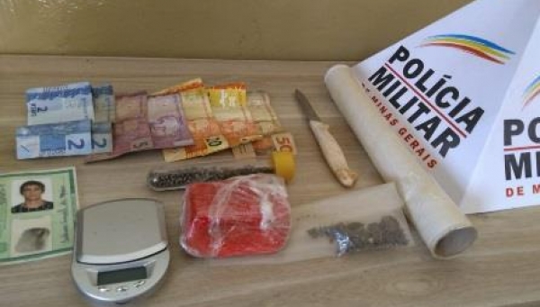No local foram encontrados um tablete de maconha, uma balança, sementes dentro de um frasco, dinheiro e uma faca