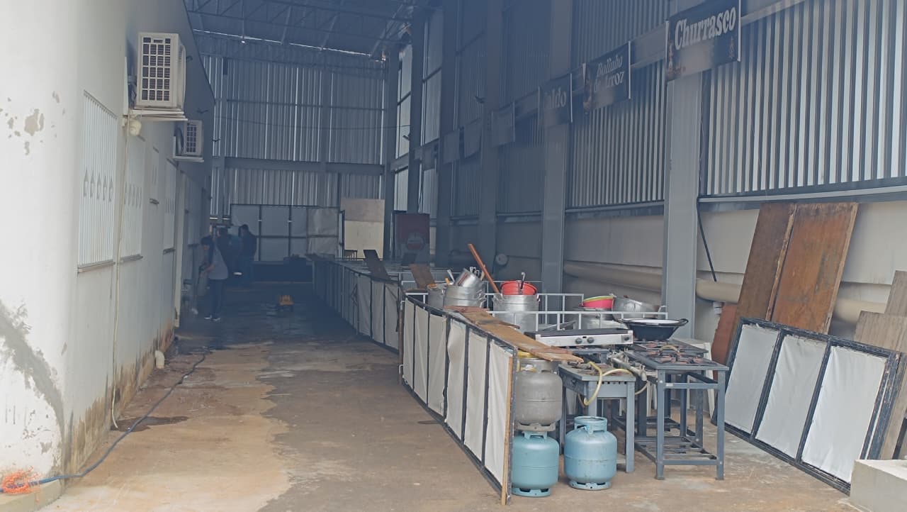 A área preparada para a festa fica nos fundos e na lateral da igreja, formando um espaço dedicado às atividades sociais, apresentações musicais e convivência dos participantes.