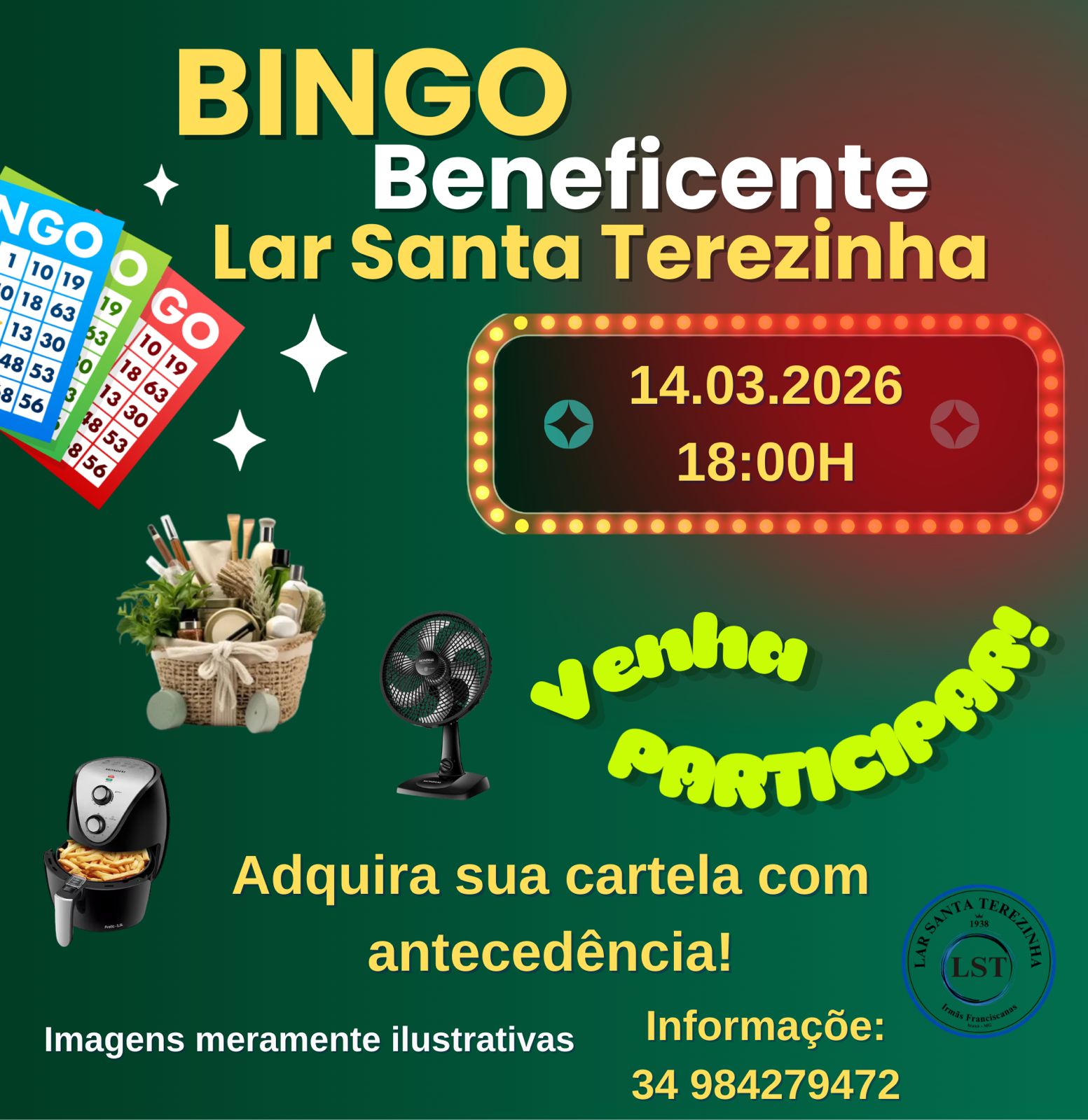 O Lar Santa Terezinha promove neste sábado (14), a partir das 18 horas, um bingo beneficente em Araxá com o objetivo de arrecadar recursos para a reforma do salão de festas da instituição. O evento será realizado na sede do lar, na avenida Senador Montandon, 735, e é aberto à participação da comunidade.