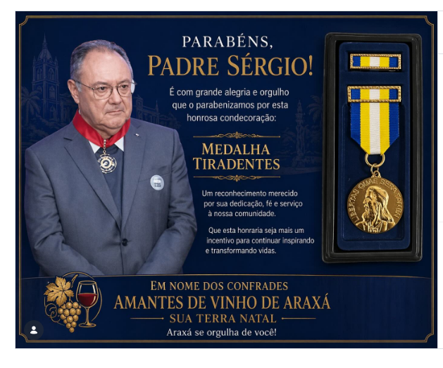 A homenagem ao padre Sérgio destaca a atuação religiosa e social desenvolvida ao longo dos anos em Araxá, reforçando o reconhecimento estadual ao trabalho realizado no município.
