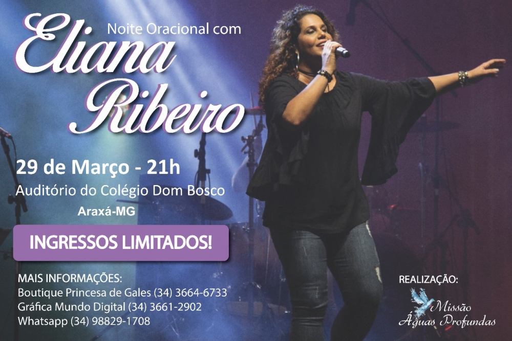 A cantora católica Eliana Ribeiro se apresentará em noite oracional no próximo dia 29 de março, às 21h, no auditório do Colégio Dom Bosco em Araxá.