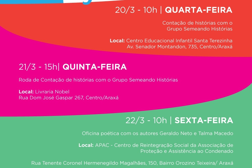 Na próxima semana, de 20 a 22 de março, terão início as atividades do pré-Fliaraxá, com eventos de contação de histórias e oficina de poesia, com acesso gratuito e aberto ao público. O objetivo é preparar a cidade para receber o Festival Literário de Araxá, que acontecerá em junho.