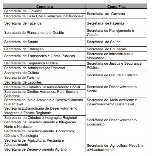 A proposta reduzirá 21 secretarias para 12 pastas, dentre elas: Planejamento e Gestão; Fazenda; Saúde; Educação; Justiça e Segurança Pública; Governo; Desenvolvimento Econômico; Meio Ambiente e Desenvolvimento Sustentável; Desenvolvimento Social; Agricultura, Pecuária e Abastecimento; Cultura e Turismo; e Infraestrutura e Mobilidade.